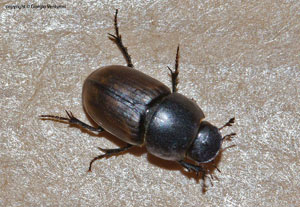| Colobopterus erraticus (Scarabaeidae, Aphodiinae). Parco Nazionale Abruzzo. Giugno. Coleottero stercorario, frequenta sterco bovino. Ottimo volatore. Il nome Colobopterus deriva dal greco colobos = troncato e pteros = ala: quindi dalle ali troncate (Le elitre sono troncate all'apice). |