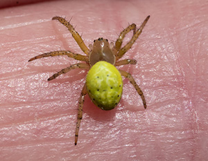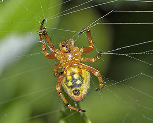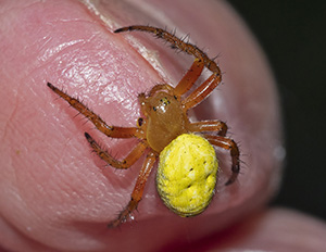 Famiglia Araneidae Presenta una macchia rossa sopra i filatoi, all'estremità dell'addome. I ragnetti appena sgusciati sono rossi. Rezzoaglio, Luglio; M. Puzzillo. Giugno. In basso a sinistra la tela che custodisce le uova