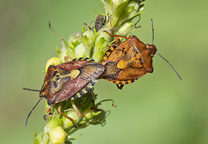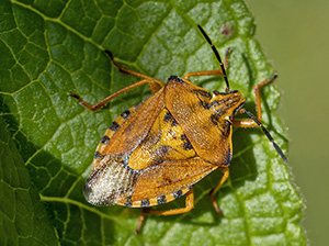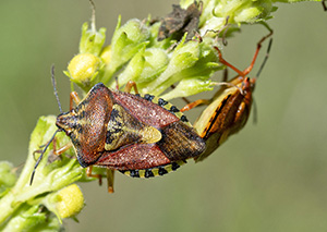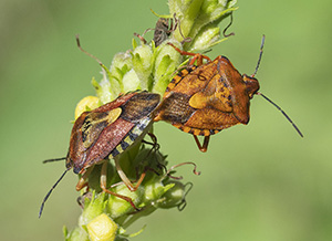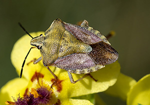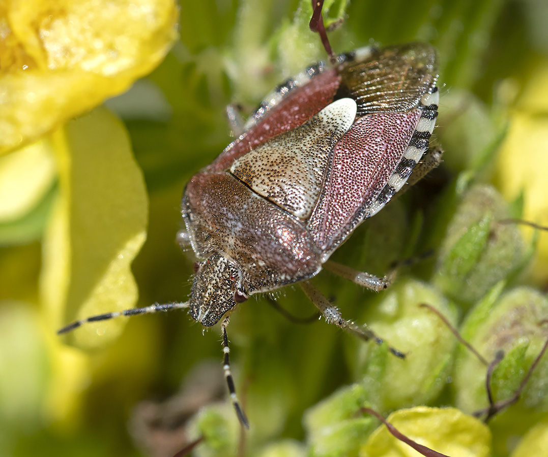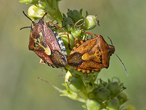| Carpocoris pudicus. Emittero Pentatomide. Rezzoaglio, luglio. Il nome carpocoris deriva dal greco karpos (καρπός) = frutto e koris: (κόρις) = cimice. Simile a Carpocoris purpureipennis che però ha, o dovrebbe avere, gli angoli del protorace più sporgenti e i margini dello scutello meno incavati. |