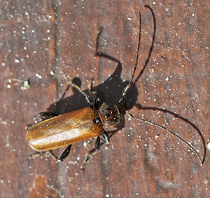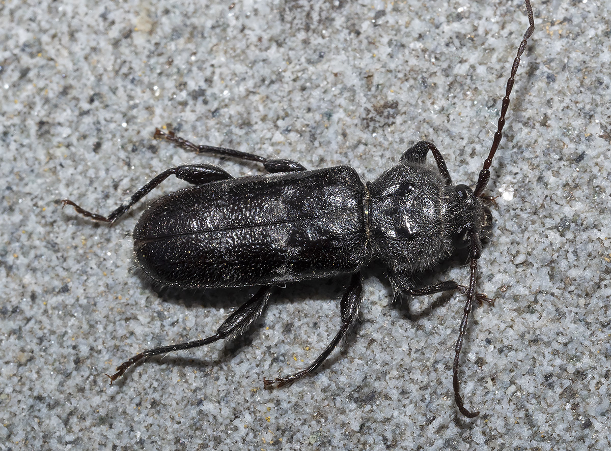 Hylotrupes. Coleottero Cerambicide. Il nome deriva dal greco : "hyle" (o hylon), che significa "legno", e "trupes", che significa "scavatore". In effetti questo coleottero che si nutre di legno e scava gellerie nei tronchi. Rezzoaglio Luglio. La colorazione è molto variabile, dal nero al marrone. |