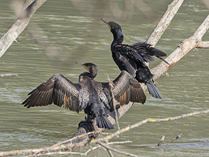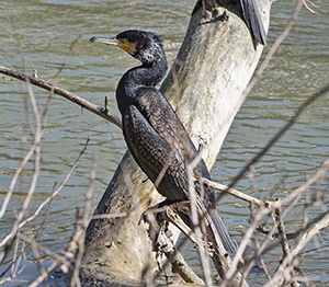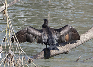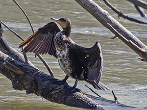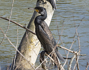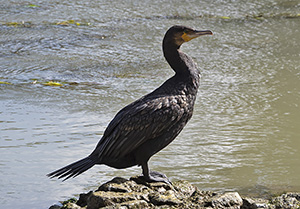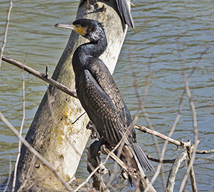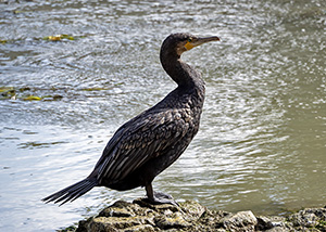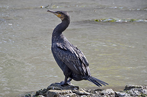 | Cormorano, Phalacrocorax carbo. Roma, Marzo-Settembre. Il nome cormorano deriva deriva dal latino corvus marinus, che significa "corvo di mare". Il nome scientifico phalacocorax deriva dal greco ϕαλακρός (phalarós) = calvo", e κόραξ (kórax) = corvo. La posizione caratteristica ad ali aperte ha la funzione far asciugare le ali. Il cormorano è un abile tuffatore e sommozzatore e la sue penne non sono impearmeabilizzate dal grasso, allo scopo di non trattenere aria durante l'immersione. Di conseguenza non tende a galleggiare. Durante l'immersione l'uccello si lascia indietro una evidente scia di bolle d'aria. Gi uccelli con penne impermeabilizzate, come le papere, non risescono bene come sommozzatori. I pulcini di pollo appena nati, che hanno le piume ancora non impermeabilizzate, se messi in acqua si bagnano come pulcini bagnati! |