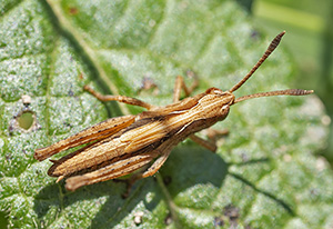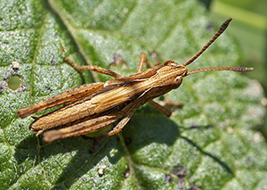 | Gomphocerippus rufus, giovanile (neanide). Ortottero Acrididae. Tipico per le antenne ingrossate a clava e biancastre all'estremità. Rezzoaglio, Agosto. Il nome deriva dal greco gomphos (γόμφος) che significa "chiodo" o "clava", e keras (κέρας) che significa "corno", quindi con le antenne a clava. |