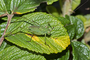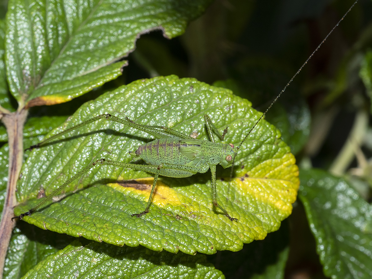 | Phaneroptera (Ninfa). Ortottero Tettigonide. Rezzoaglio (Penna), luglio. Il nome rederiva dal greco, "phaneros" (φανερός) significa "visibile" e "pteron" (πτερόν) significa "ala". Quindi ali visibili, per il fatto che nell'adulto le ali posteriori sono solo parzialmente coperte dalle anteriori e quindi risultano visibili. |