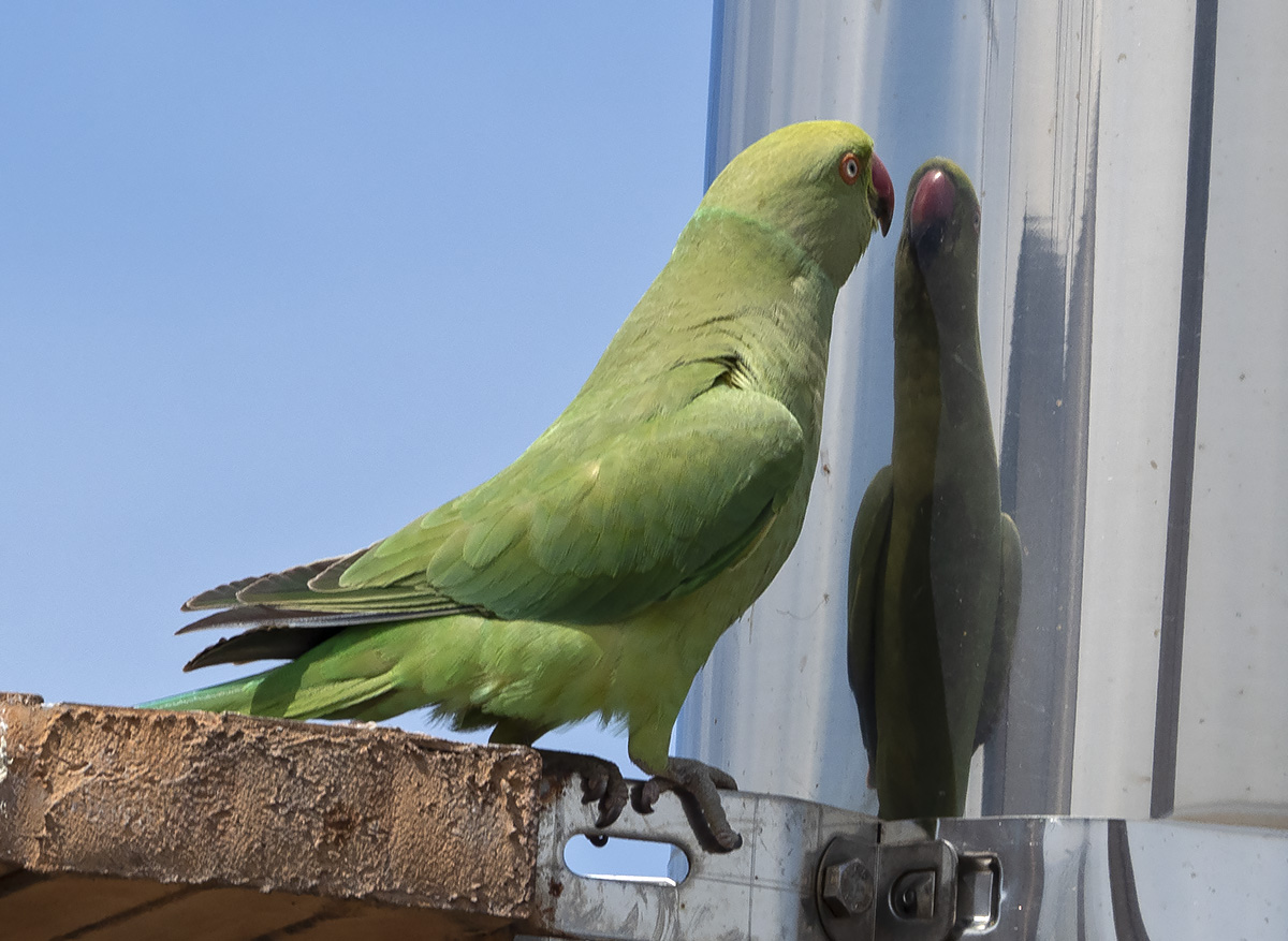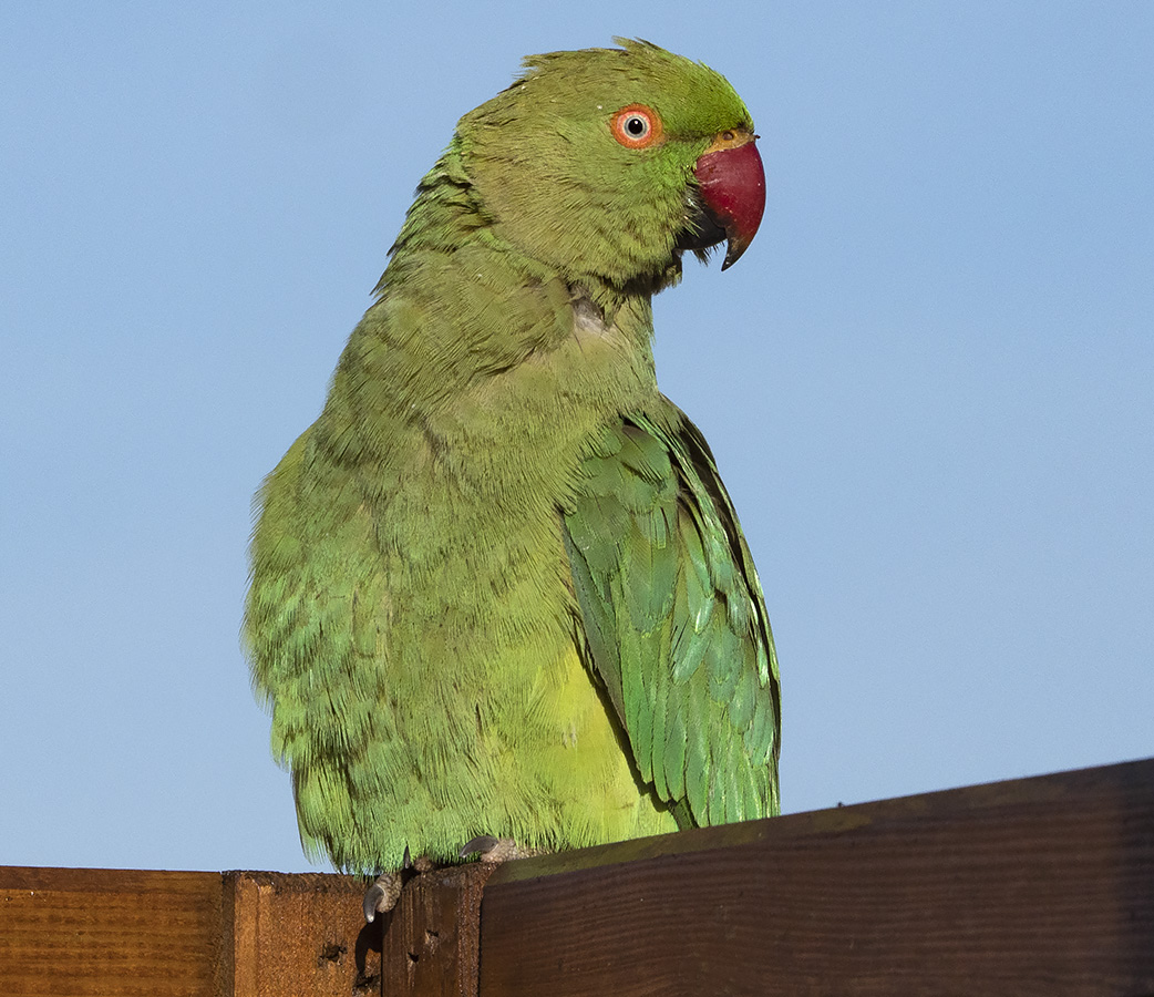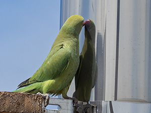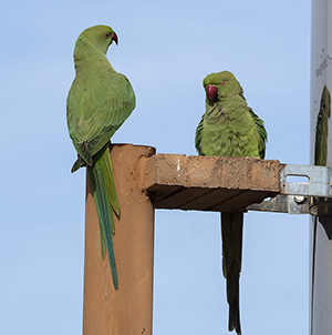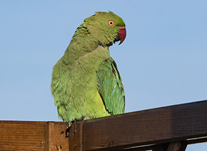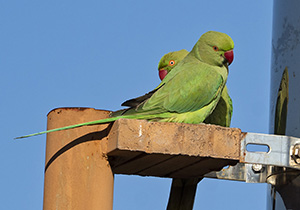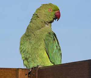 | Psittacula krameri. Parrocchetto dal collare. Uccello di origine africana e indiana. Esemplari sfuggiti alla cattività o liberati si sono riprodotti in modo invasivo, diventando una minaccia poichè competono con le specie locali, oltre ad essere vettori di malattie che possono colpire anche l'uomo (psittacosi). I maschi maturi mostrano un collare rossiccio. Psittaciforme. Roma Maggio. |