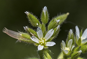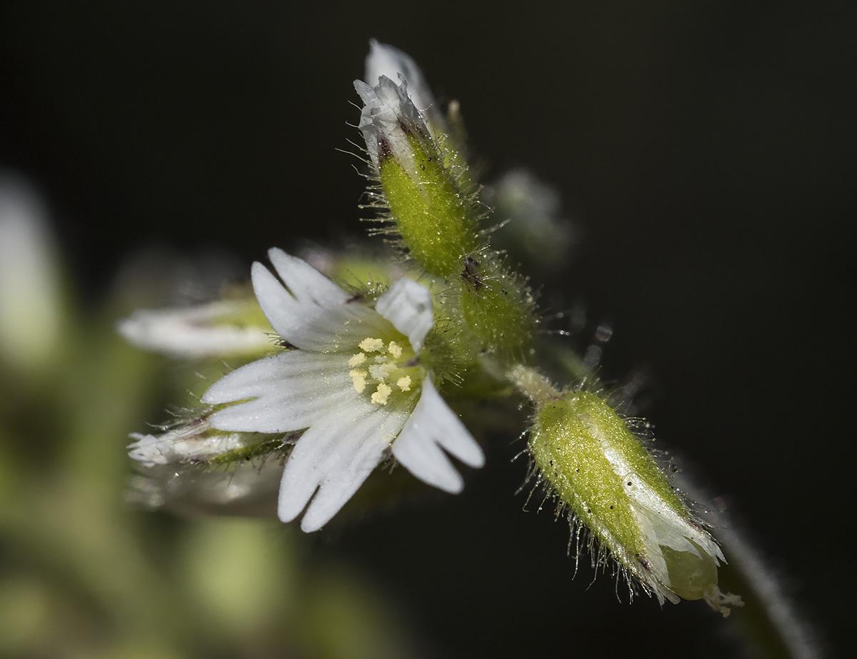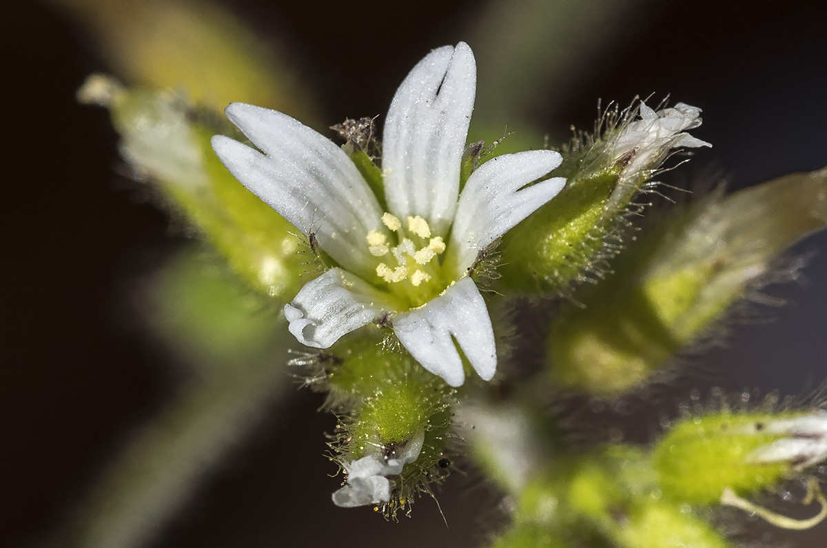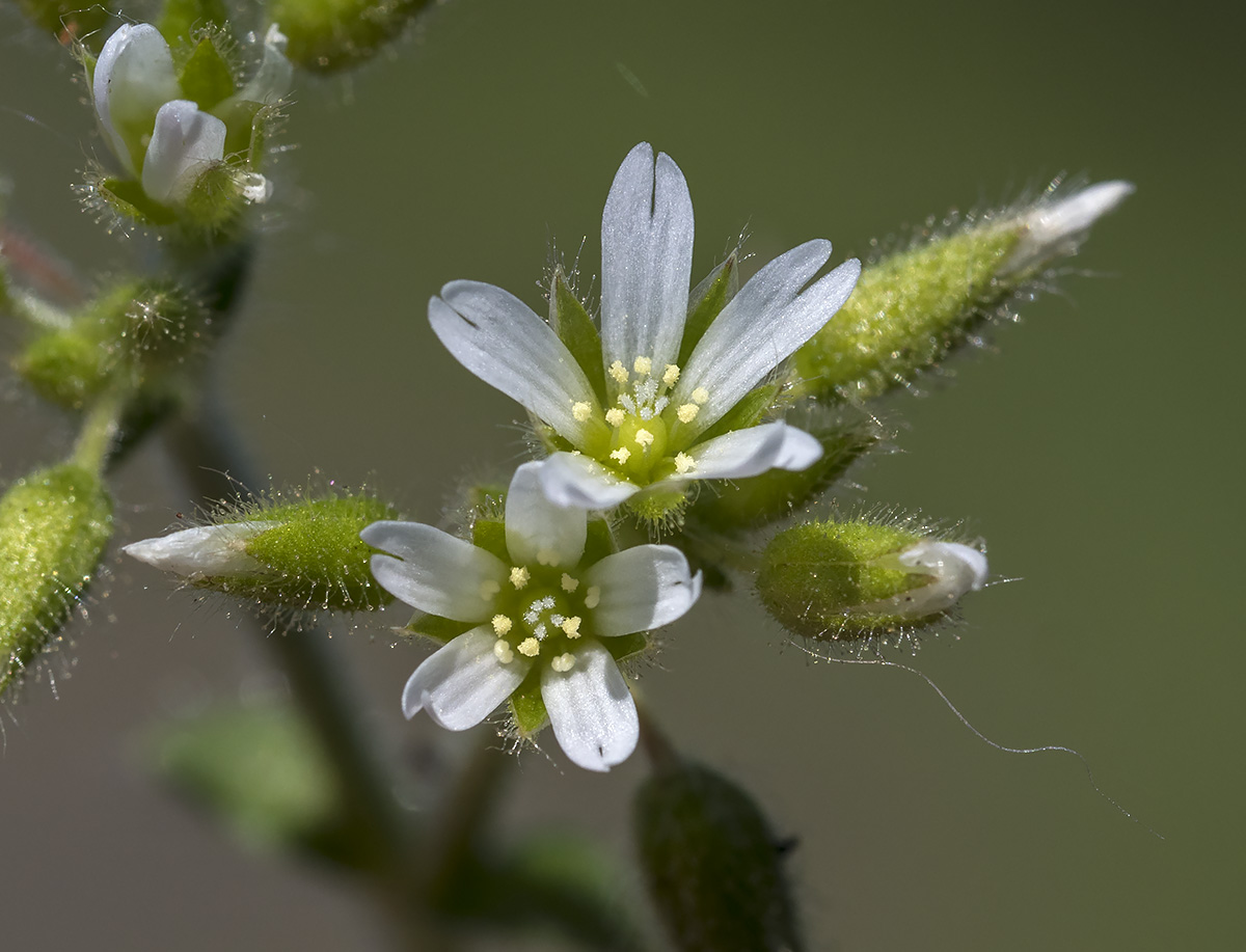 5-25 cm, fusti pelosi, foglie ovali. Fiori con peduncoli brevissimi, che quindi si riuniscono in mazzetti, da cui il nome. Petali bianchi, bifidi all'apice. Comune, infestante.