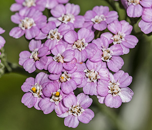 Achillea millefolium - Composita. Foglie fortemente frastagliate a pettine (millefolium), alterne. Fiore a ombrello, aromatico, bianco o rosato. Altezza tra 20 e 60 cm. Pianta medicinale, tonica, antispasmodica, vulneraria. Achille ne avrebbe scoperte le qualitą cicatrizzanti. (Rezzoaglio - Luglio). Come in altre Achillea i fiorellini centrali sono evidentemente tubulari, generando un aspetto bucherellato al centro del fiore. E' la pił comune delle Achillee, diffusa ovunque. |