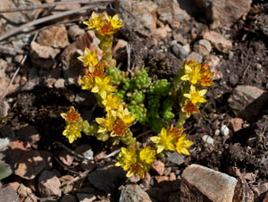 | Sedum acre Crassulacee. Pianta carnosa, con foglioline aderenti al fusto. Alto pochi cm. Fiori in genere a 5 petali. Il Sedum acre (erba grassa, erba pignola o erba da calli) forma in genere tappeti fitti con fiori gialli a stella. Ha sapore pepato (se lo assaggi non inghiottire. E' un pò velenoso. (Il S. mite non ha sapore acre). Il nome sedum (seduto) è dovuto al portamento dello stelo oppure deriva da sedare, calmare, per proprietà calmanti. Il S. reflexum, più snello, ha fiori prima globosi e a maturazione concavi. A differenza dei Sempervivum i Sedum non hanno foglie a rosetta basali. (Terminillo, M. Calvo, Ottobre, Rezzoaglio (M. Penna) Giugno | ![]() |