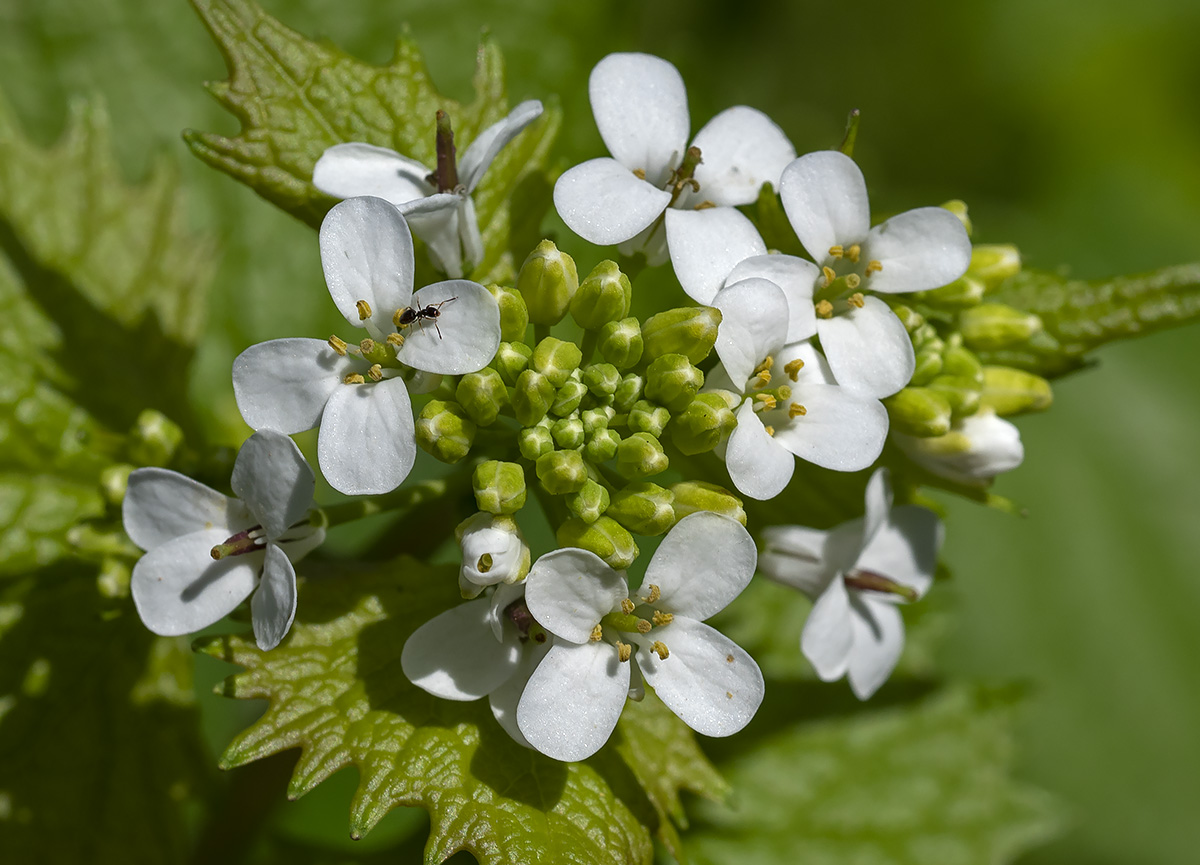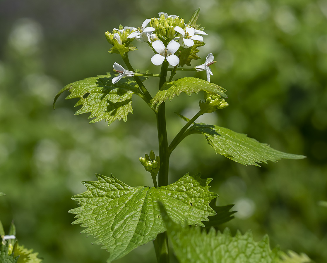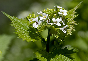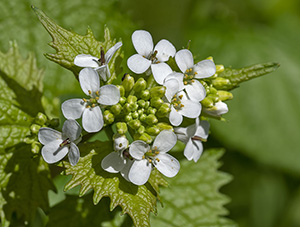 | Alliaria petiolata – Crucifere – 20 -100 cm. Foglie a forma di cuore, peduncolate, con margine dentato. Fiori bianchi di 5-8 mm. Silique lineari, di 2-3 cm, erette. Comune nei boschi. Il nome alliaria si riferisce all’odore della pianta, evidente quando viene schiacciata. Petiolata da petiolus, piedino, peduncolo. Utilizzata per salse e condimenti. Rezzoaglio, Aprile, Maggio; Monte Navegna, Aprile; Lago di Vico, Aprile, Roma maggio |
