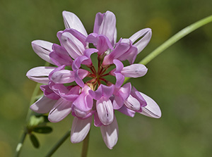Coronilla varia - (Da piccola corona, per la disposizione dei fiori) Leguminosa - Vecciarini - Foglie con 11-25 foglioline - fiori come quelli del pisello, riuniti in gruppi a corona, da cui il nome, rosa. Fusto piatto,strisciante. Comune ai bordi delle strade dove forma piccoli cespugli a cuscino. Velenosa, contiene principi analoghi alla digitale. (Rezzoaglio, Giugno, Luglio). |