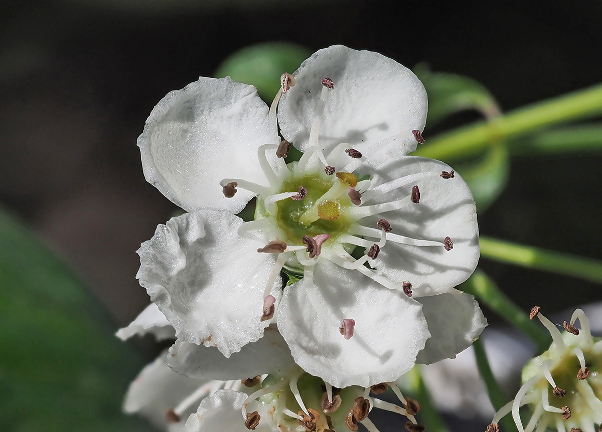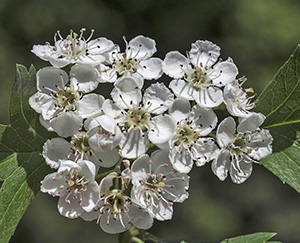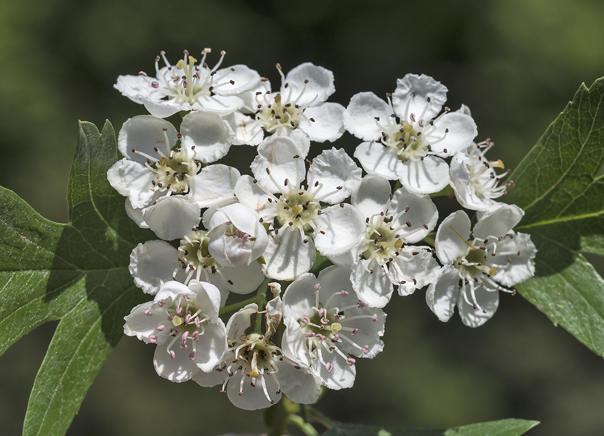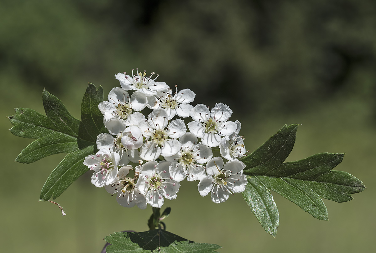 Crategus monogyna, (Dal greco kratos, forza, per la durezza del legno; monogyna, con un solo ovaio) Biancospino, Rosacea. Albero fino a 10 m, ma spesso molto più piccolo. Foglie incise in 1-3 lobi dentati, lisce, lucide e superiormente scure. Corteccia bruno-rossastra, fessurata. Fiori bianchi a grappoli, primaverili. Frutti ovali, rossi |
