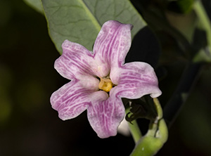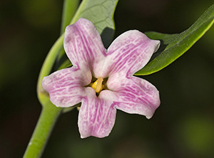 Araujia sericifera. Roma (Forte Antenne). Marzo-Giugno. Apocynaceae. Dedicata a Antonio de Araujio, naturalista dilettante Portoghese vissuto tra il 18° e il 19° secolo. Sericifera per i pappi setosi. Il frutto è lungo una decina di centimetri. Pianta di origine tropicale Sud Americana, coltivata come ornamentale e invasiva. Al taglio rilascia un abbondante lattice bianco e viscoso. Fiori bianchi o più o meno screziati di rosa, con le macchie tipicamente non nitide, che appaiono sfocate. |