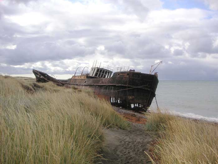 Arriviamo allo stretto di Magellano e, al freddo e al vento, aspettiamo il traghetto. |